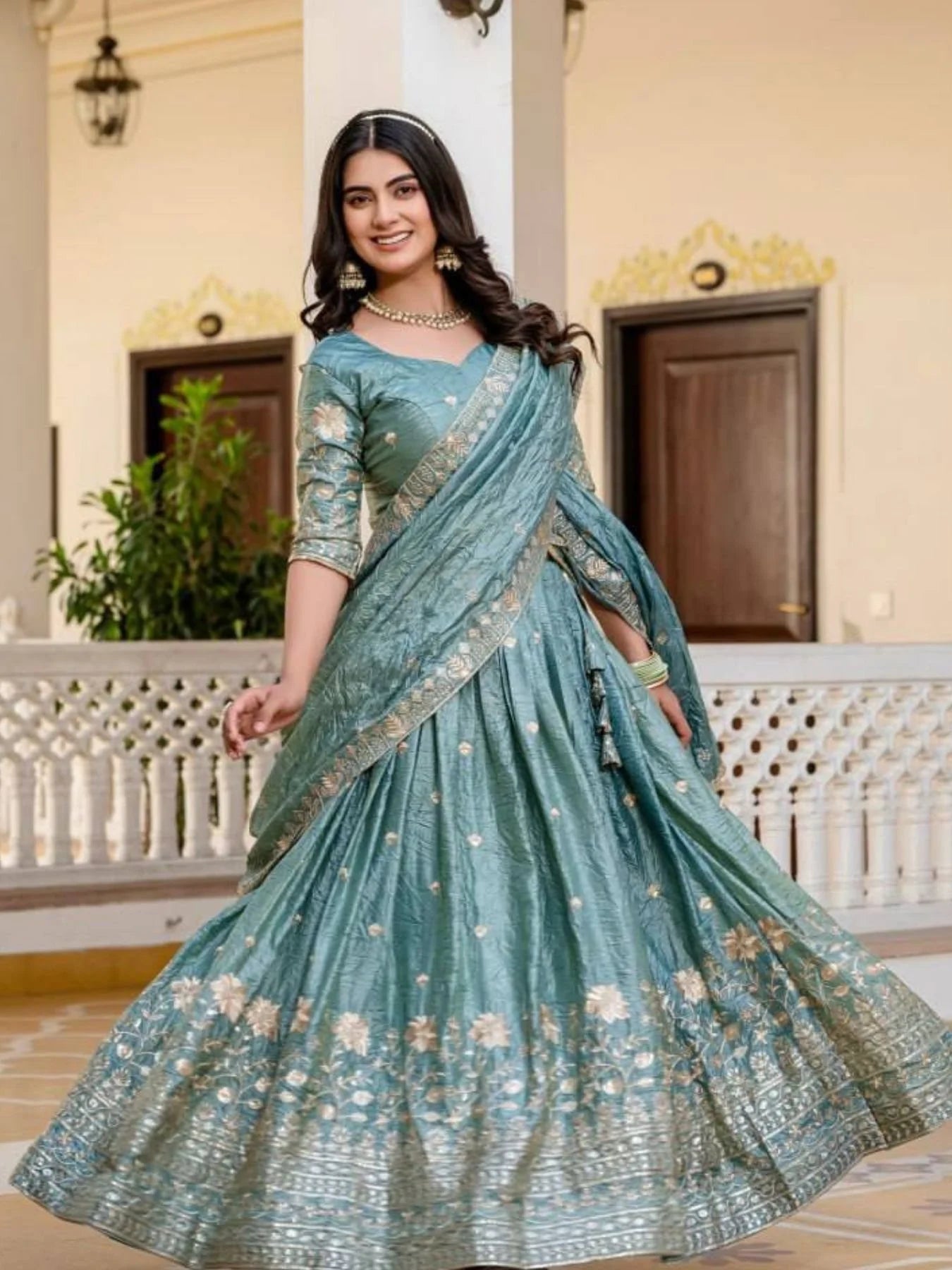 Discover the perfect fusion of traditional and modern with our Blue Crush Silk Lehenga. This luxurious piece features exquisite heavy border work, making it a showstopper at any party. The smooth silk fabric adds a touch of elegance, while the vibrant blue color adds a pop of color to your wardrobe. Elevate your style with this must-have collection.