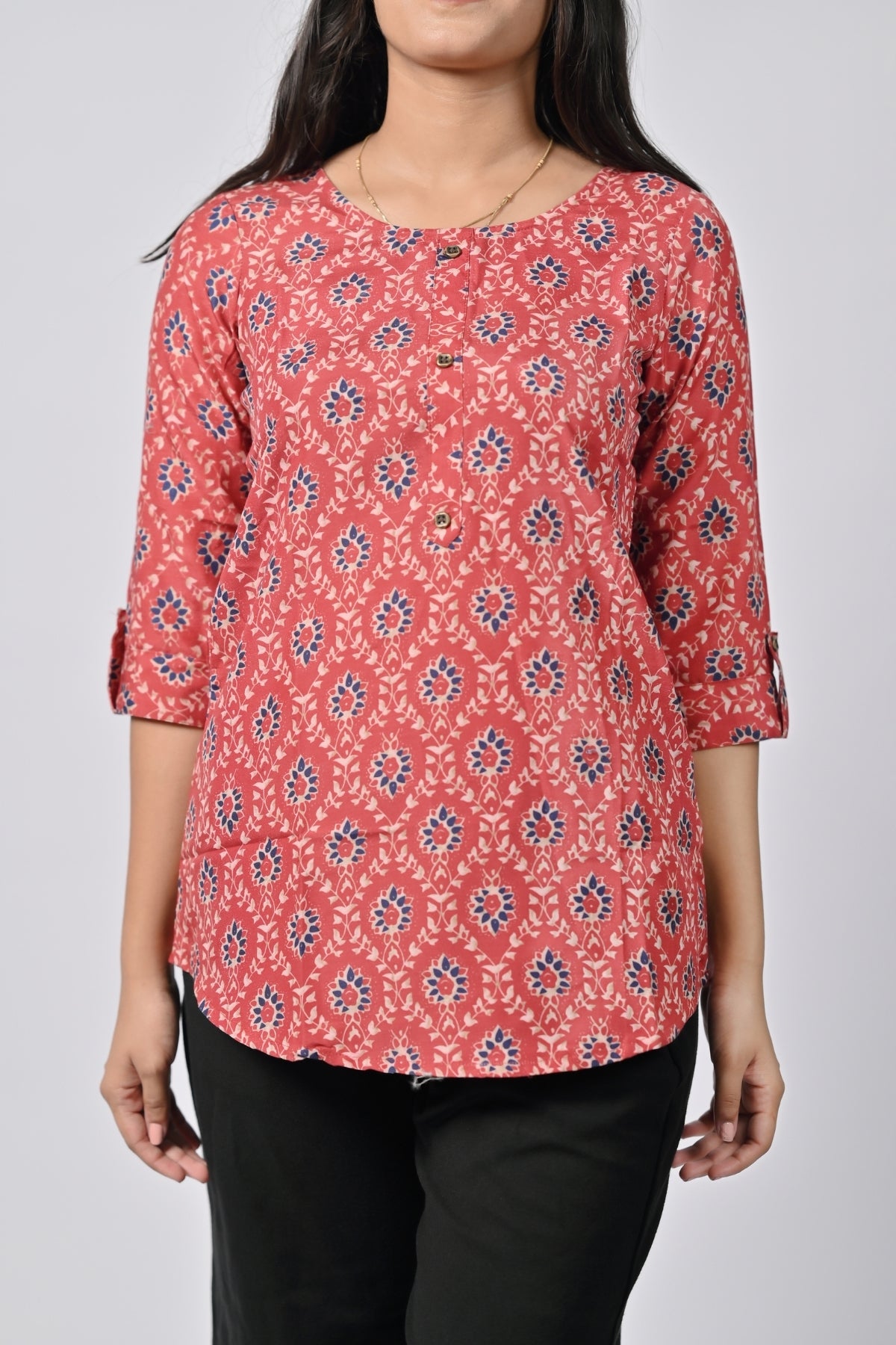 | This vibrant coral top features a stylish paisley print, bringing a fresh and lively look to your wardrobe. With its relaxed fit and round neckline, it offers a perfect balance of comfort and style. The 3/4th sleeves provide versatility, making this top suitable for both casual outings and semi-formal occasions. Pair it with jeans or trousers for a chic, everyday ensemble that’s both trendy and comfortable. |