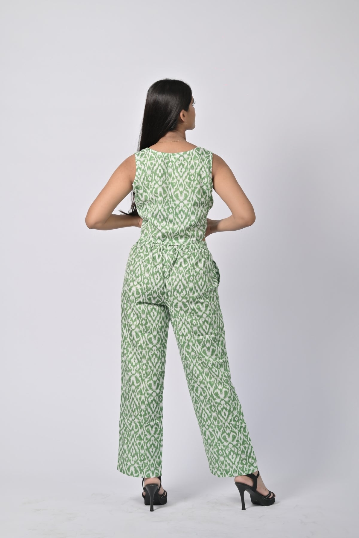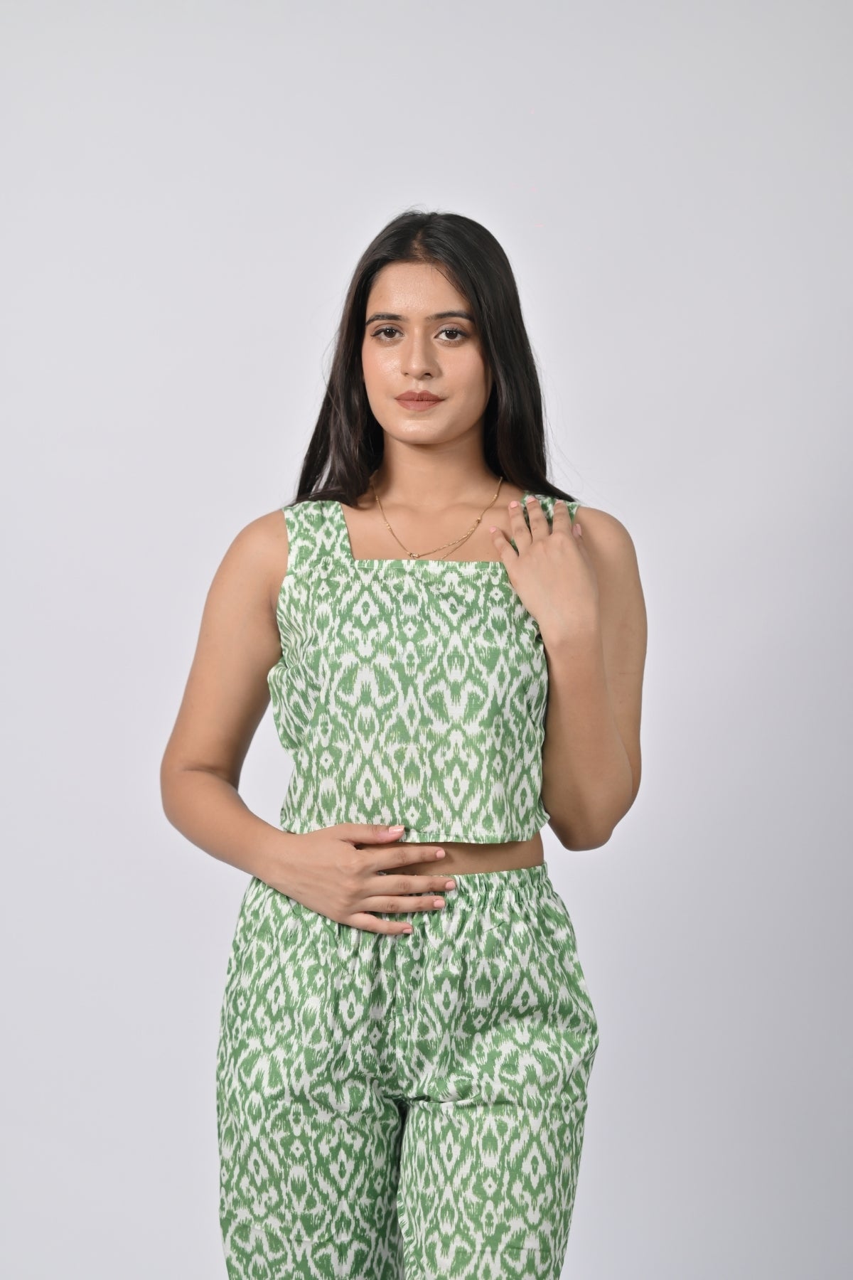 | This chic floral crop top and pants set is perfect for a casual, stylish look. The ruffled crop top adds a fun and flirty touch, while the matching pants with an adjustable drawstring waist ensure comfort and ease. The vibrant floral pattern enhances the playful, relaxed vibe of the outfit, making it ideal for warm days and casual outings. |