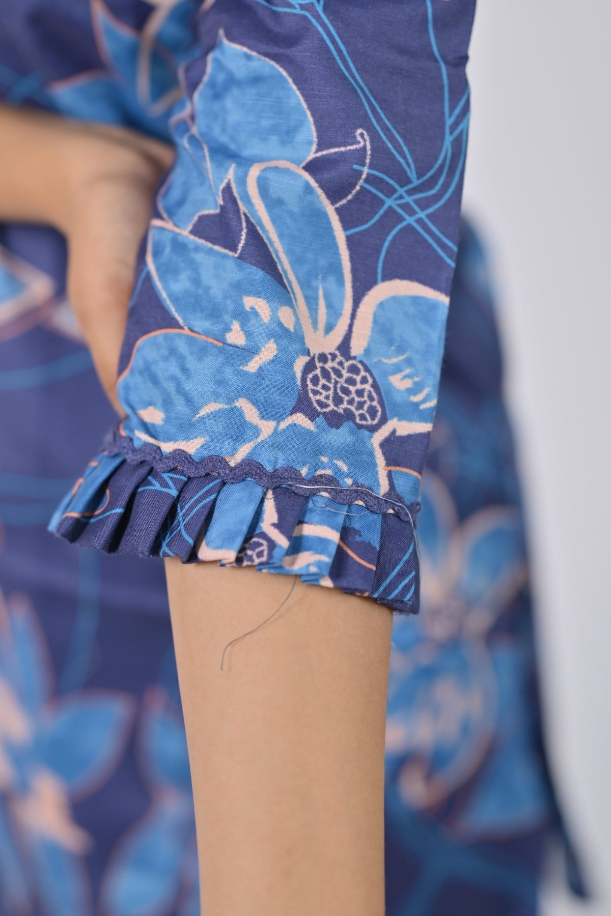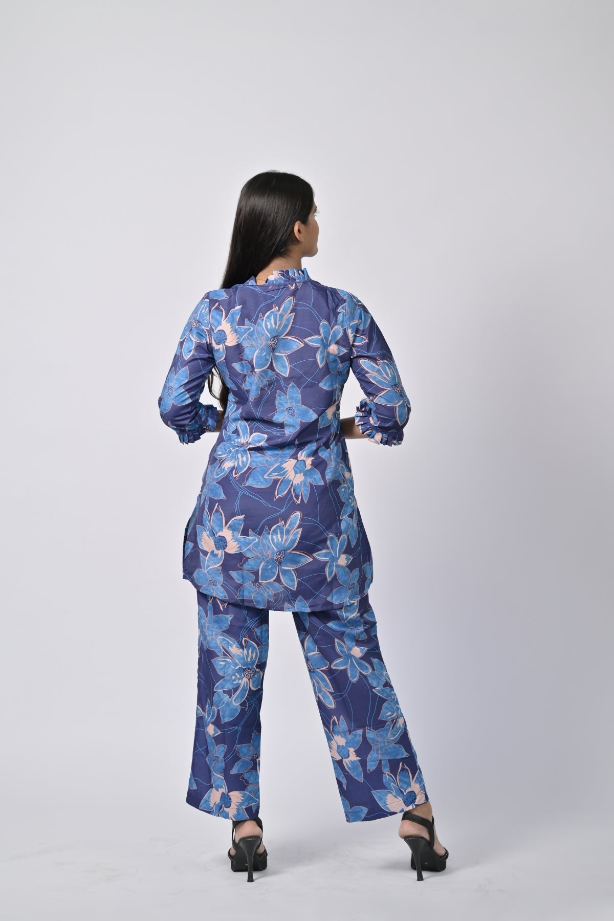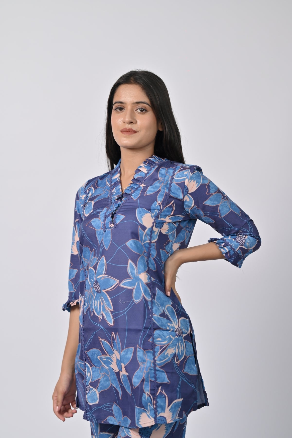 | This elegant tunic set in a blue floral pattern offers both style and comfort. The tunic features a button closure neck, adding a classic touch, and pairs beautifully with matching floral-print pants for a complete, stylish look. Ideal for casual outings or relaxed occasions, it combines effortless charm with a modern silhouette. |