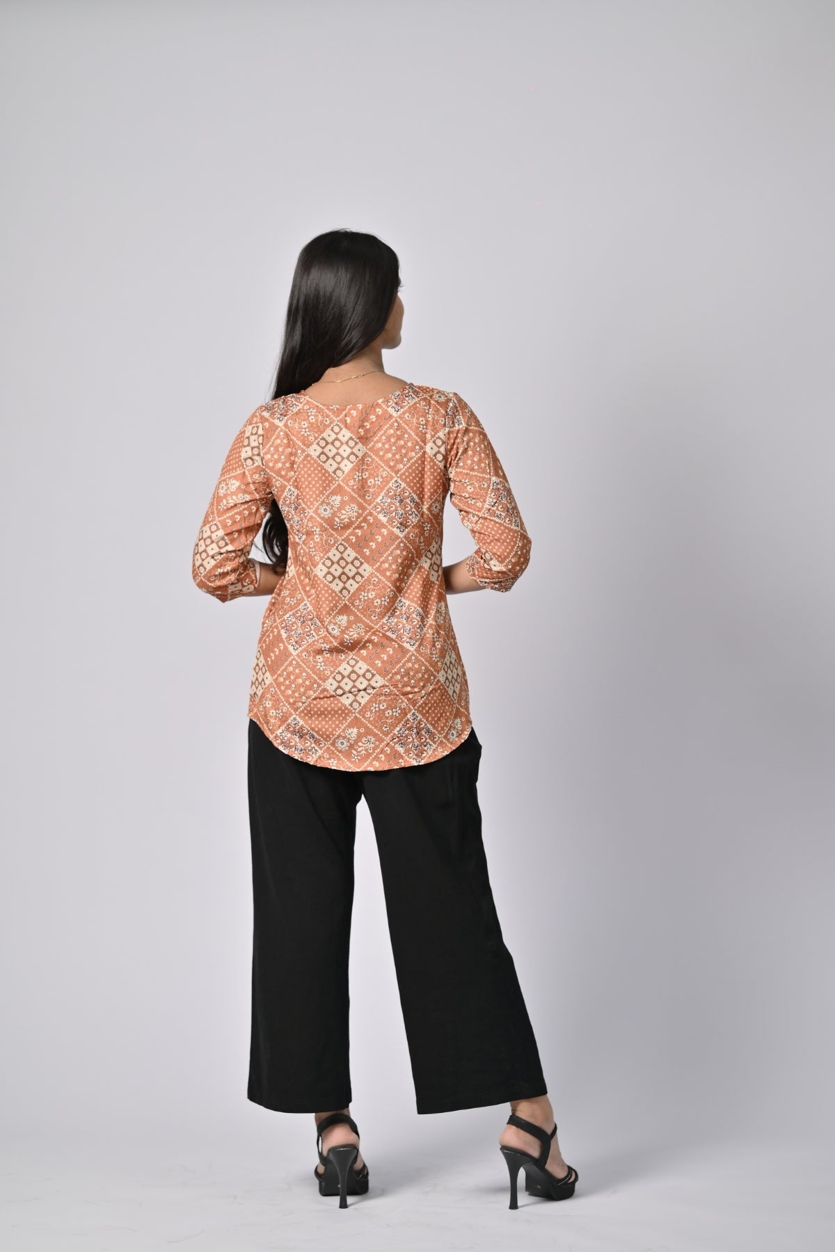 | This stylish top features a beautiful printed design, creating a chic look for casual outings. The button closure ensures ease of wear, and the comfortable neck type adds to its relaxed fit. Ideal for day-to-day wear, this top is made from soft fabric, offering both comfort and style. Whether paired with jeans or skirts, it is a versatile addition to your wardrobe. |