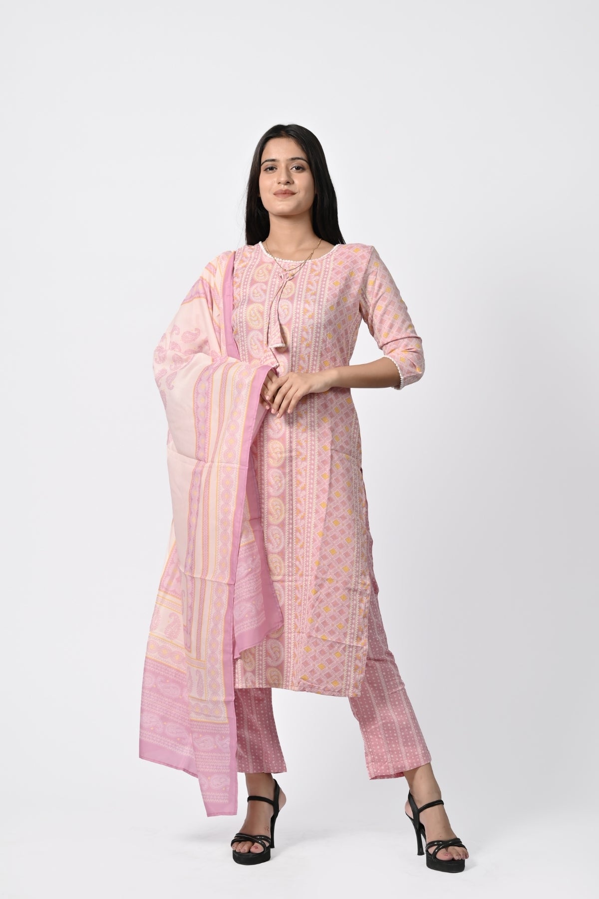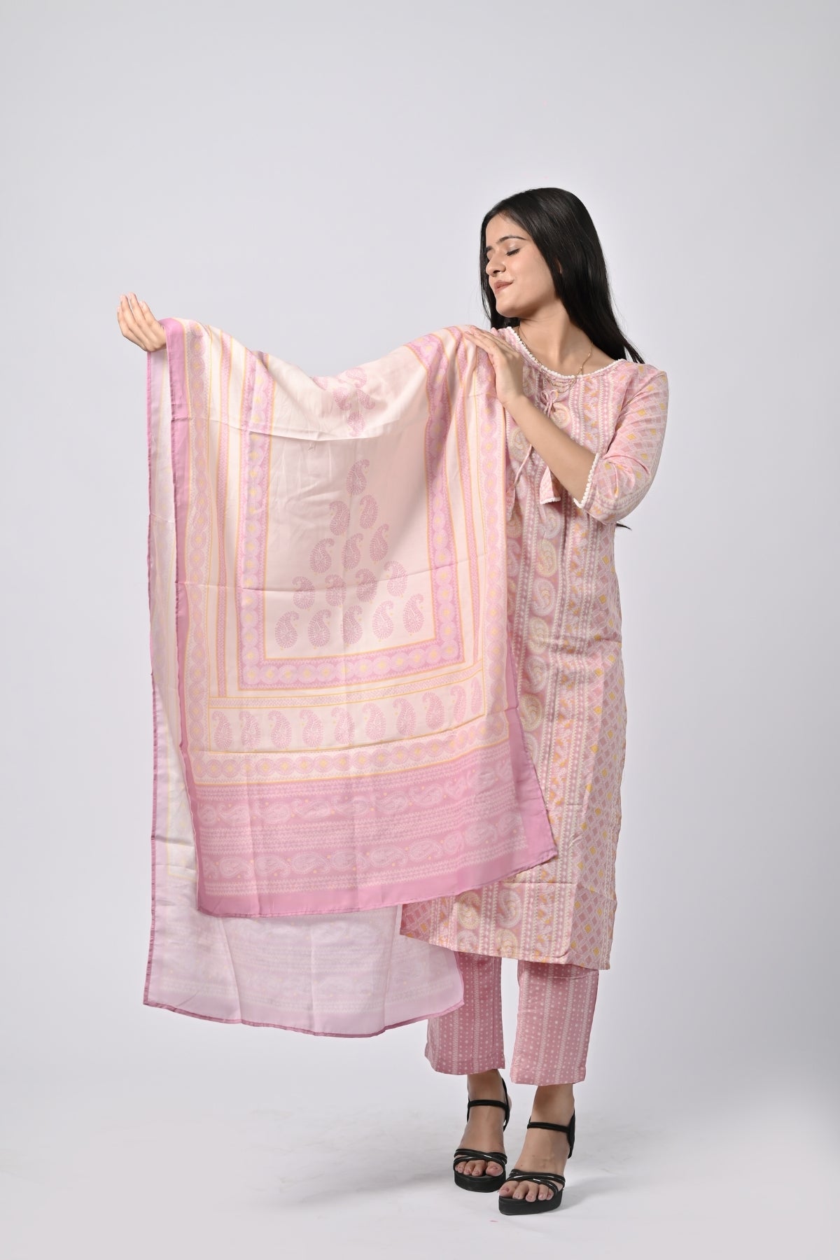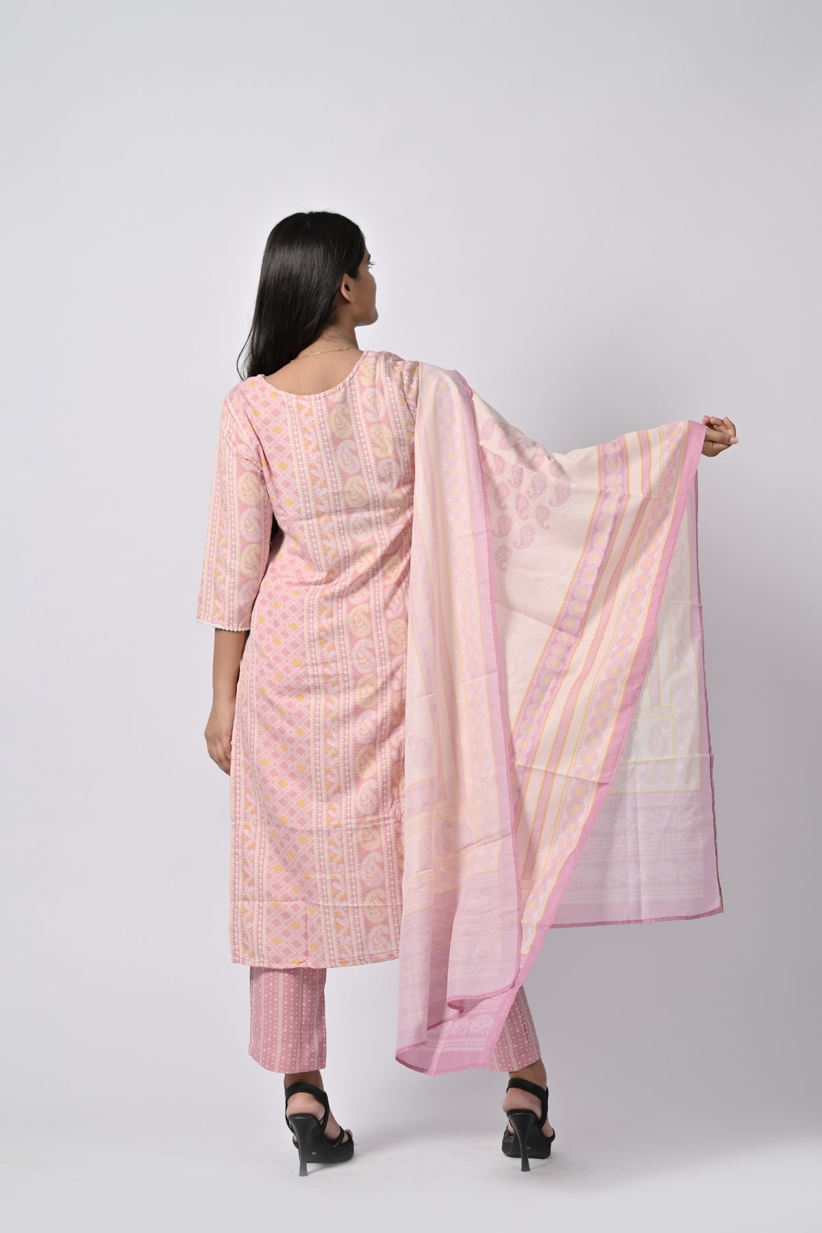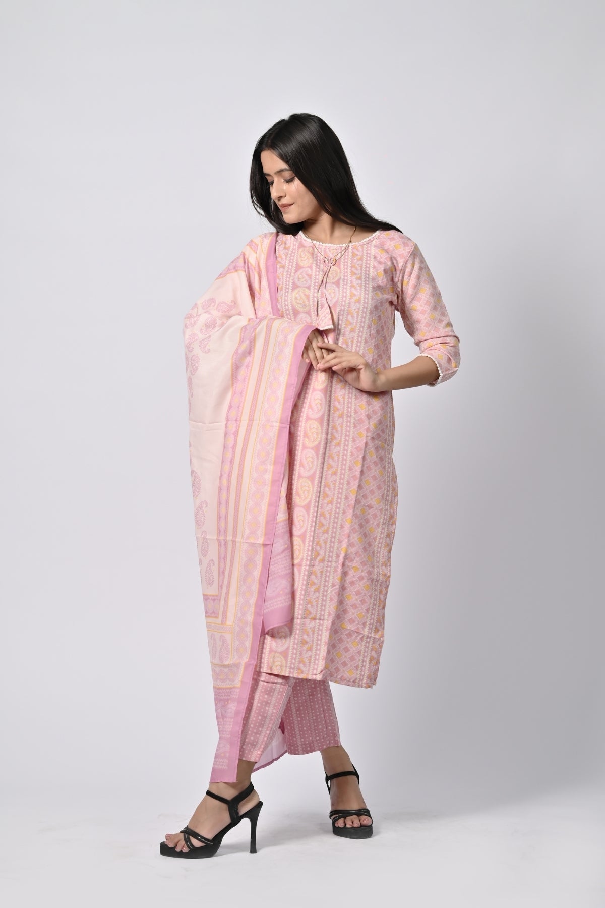 | This soft pink floral printed kurti is perfect for a light and graceful look. Made from soft cotton, it ensures comfort while giving off an elegant vibe. The kurti features a beautiful floral print and comes with a matching dupatta, adding an extra touch of sophistication. The straight cut and 3/4th sleeves enhance the simplicity and class, making it a perfect choice for casual outings, festivals, or family gatherings. |