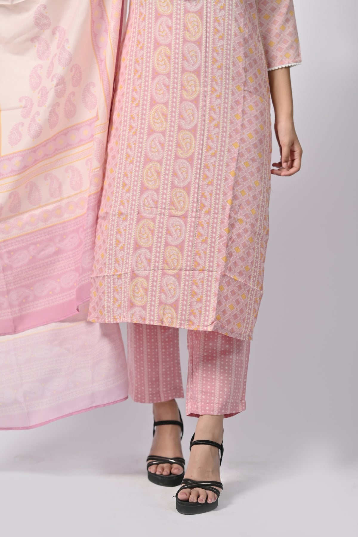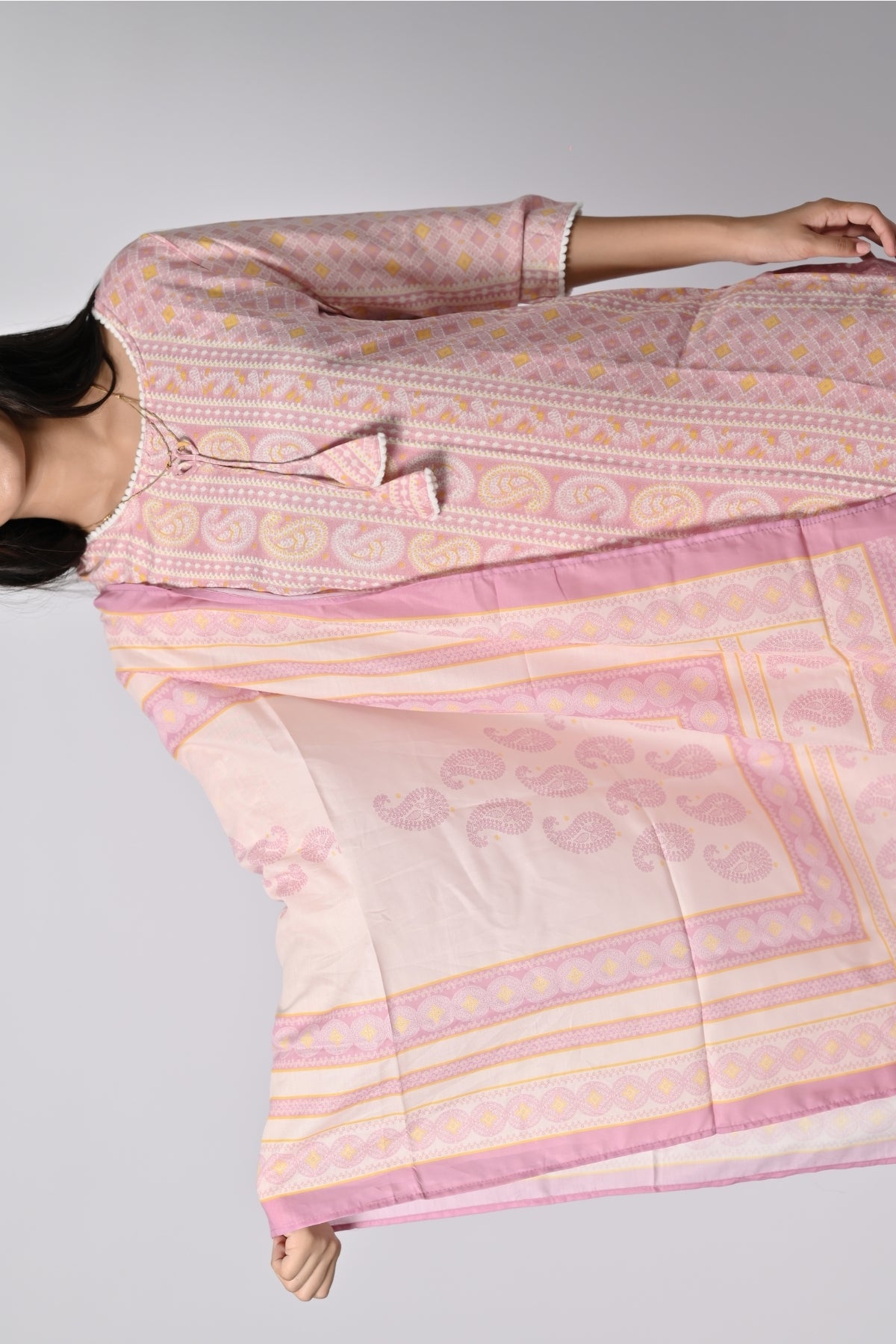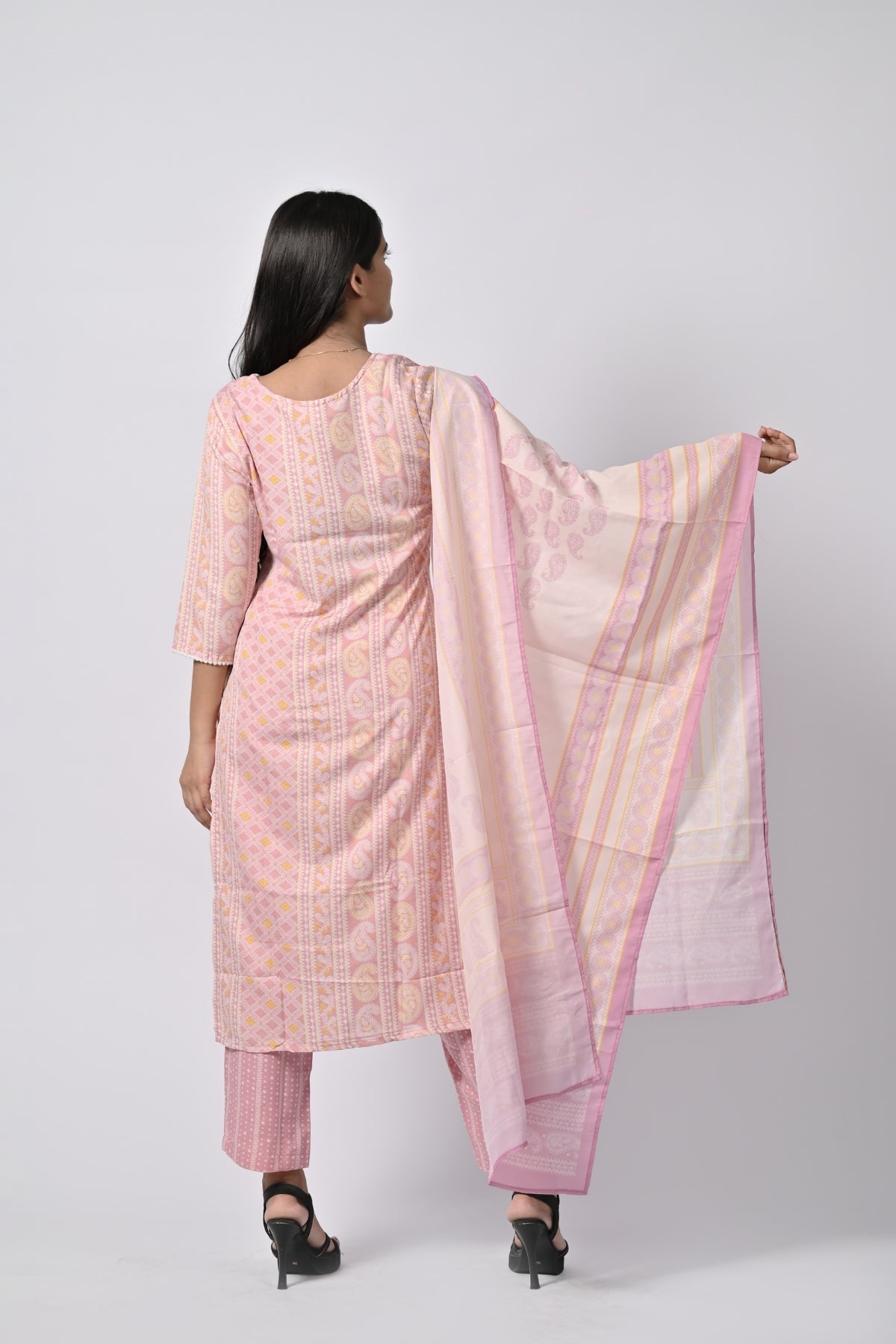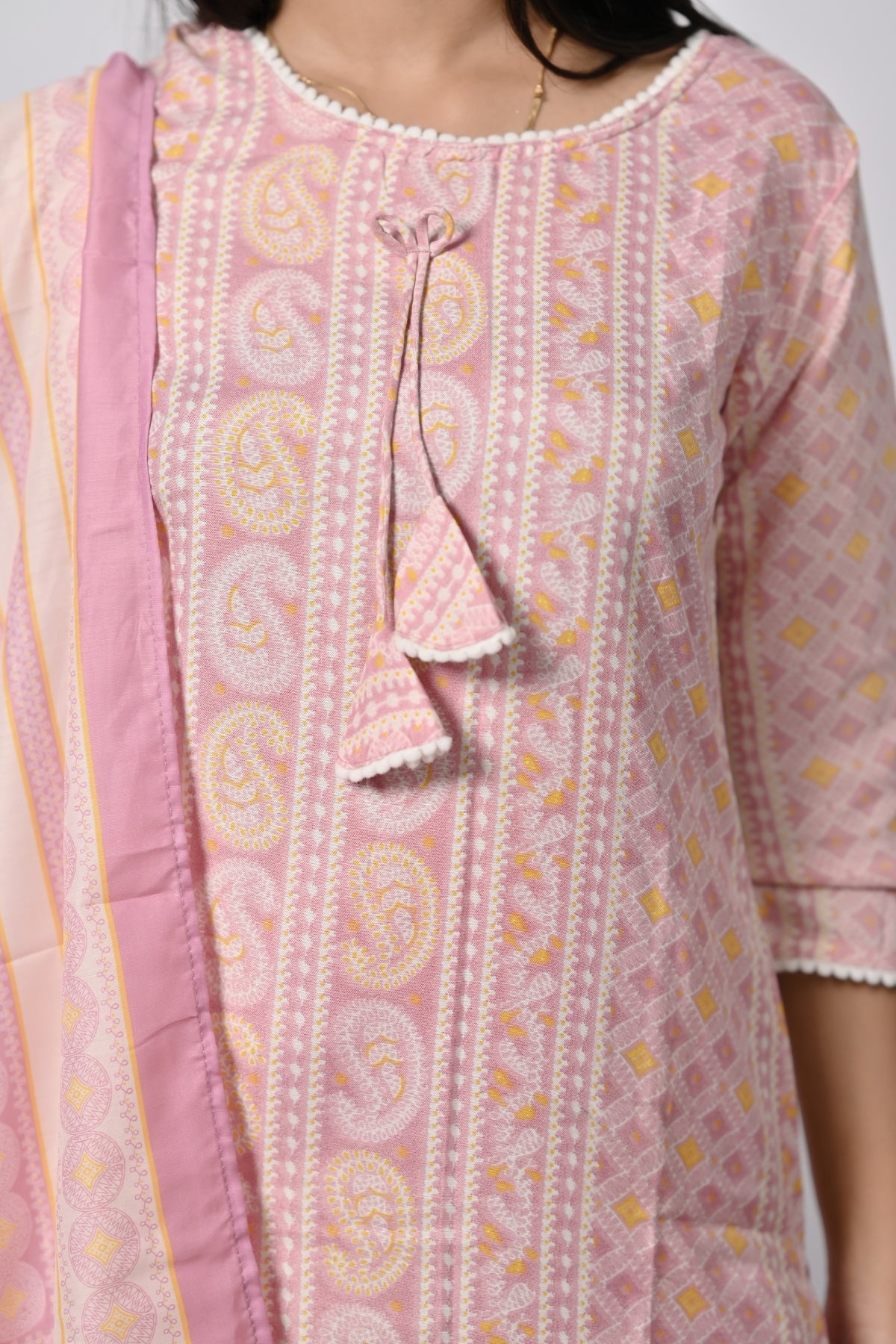 | This soft pink floral printed kurti is perfect for a light and graceful look. Made from soft cotton, it ensures comfort while giving off an elegant vibe. The kurti features a beautiful floral print and comes with a matching dupatta, adding an extra touch of sophistication. The straight cut and 3/4th sleeves enhance the simplicity and class, making it a perfect choice for casual outings, festivals, or family gatherings. |