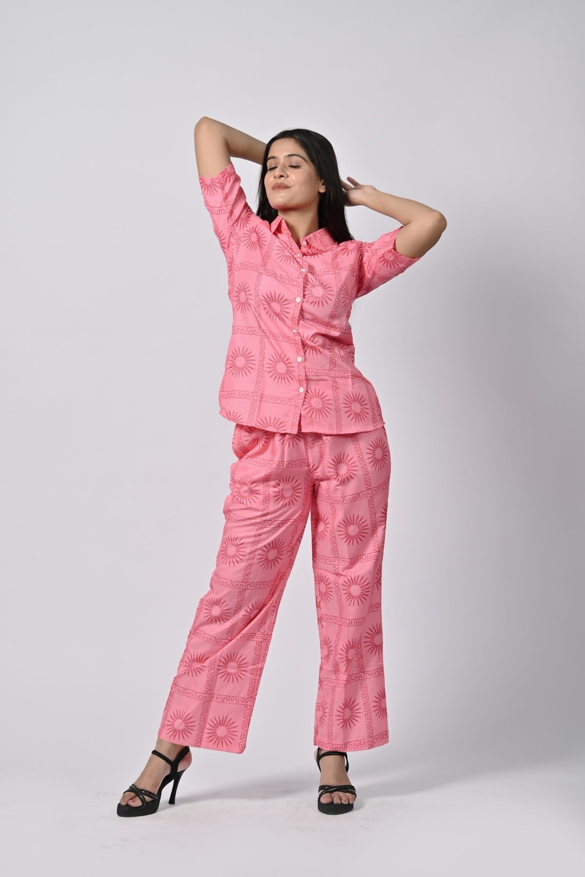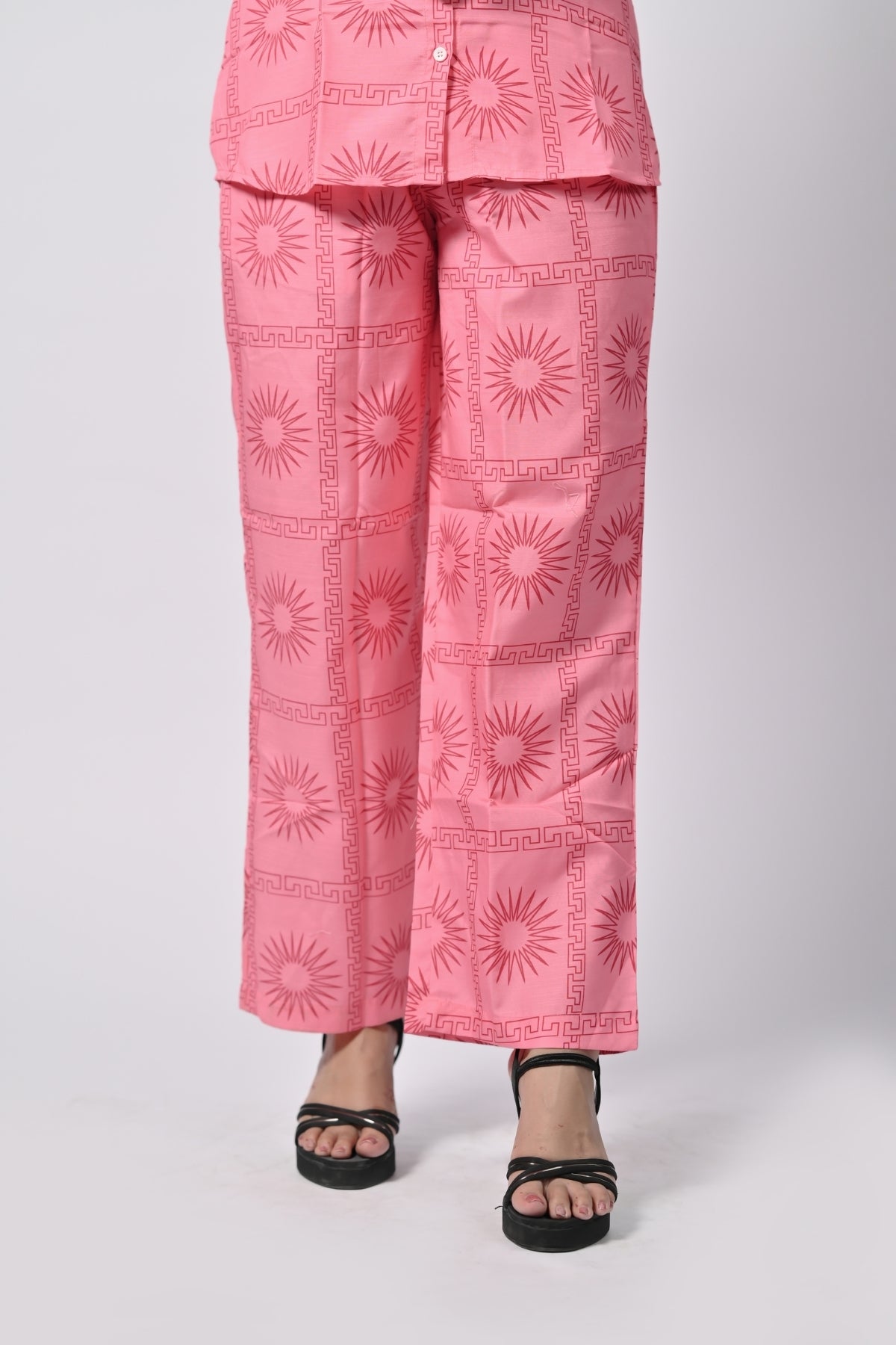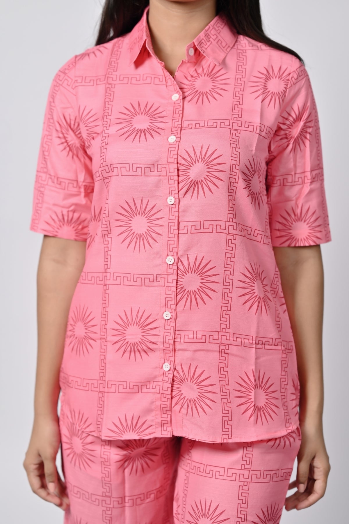 | This soft pink printed tunic and pants set is the perfect balance of comfort and style. The tunic features a classic button-down closure, while the matching pants offer a relaxed fit, making it suitable for casual outings or even office wear. The delicate print adds an elegant touch to the outfit, ensuring you look effortlessly chic. |
