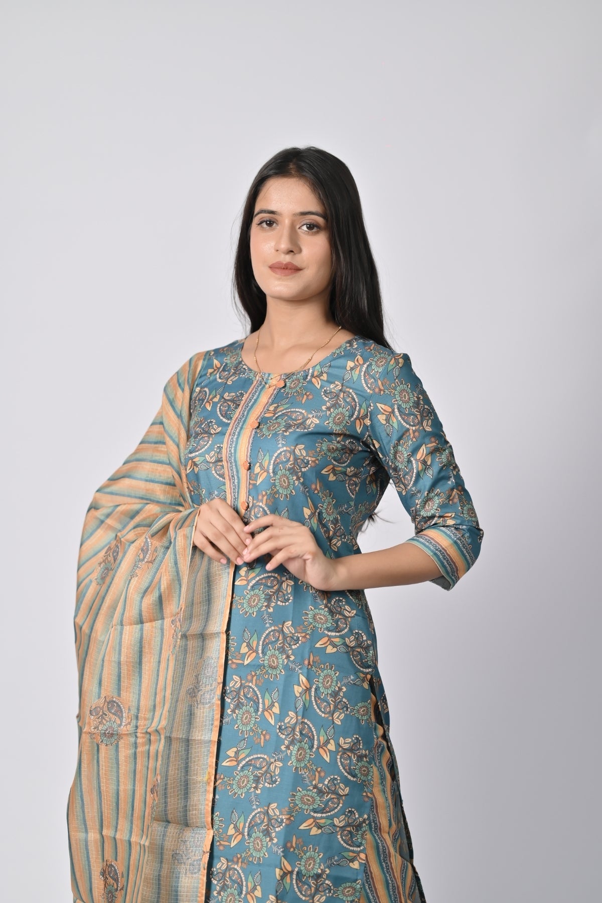 | Add charm to your ethnic collection with this Women’s Green Floral Cotton Suit Set. The kurta showcases intricate floral prints, paired with matching straight pants for a refined look. The highlight of this set is the contrasting dupatta, designed with floral and striped patterns, adding elegance to your style. Crafted from soft and breathable cotton, it ensures comfort and grace for any occasion. Perfect for festive celebrations, casual gatherings, or office wear, this set blends tradition with modern sophistication. |