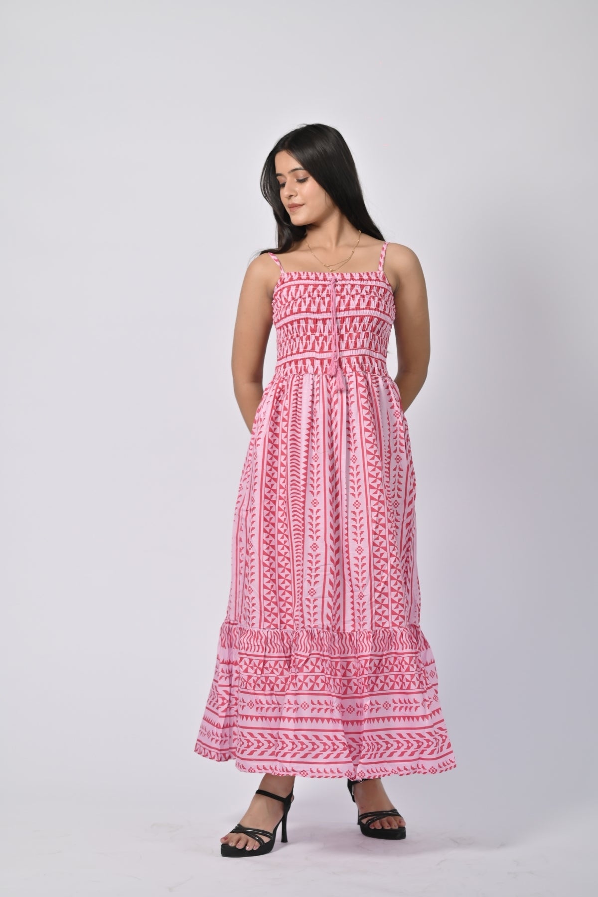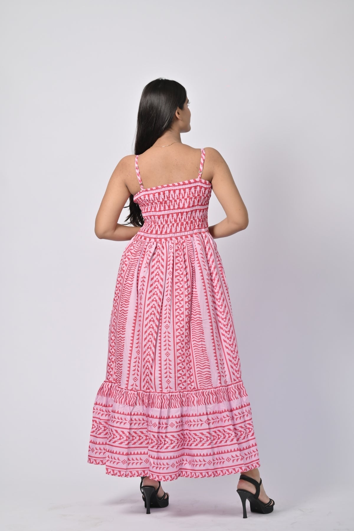 | Step out in style with this Women’s Pink Printed Sleeveless Maxi Dress. Designed with an ethnic-inspired all-over print, it features a flared hem with tiered detailing that adds volume and elegance. The sleeveless design and fitted bodice provide a flattering silhouette, while the lightweight, breathable fabric keeps you cool and comfortable all day. Ideal for vacations, casual outings, or brunch dates, this maxi dress is a perfect blend of comfort and fashion, making it a must-have addition to your wardrobe. |